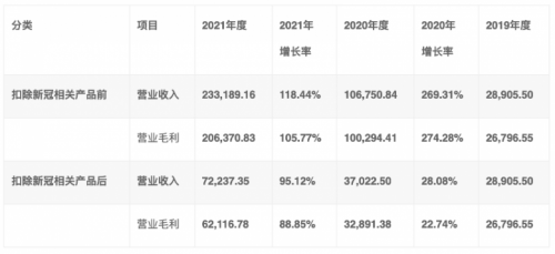 招股书显示,报告期内的2019年、2020年和2021年,菲鹏生物分别实现营收2.89亿元、10.68亿元和23.32亿元,分别同比增长30.61%、269.31%和118.44%;同期,净利润分别为5745.49万元、6.33亿元和15.03亿元,分别同比增长133.53%、1001.95%和137.38%。